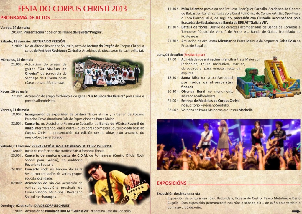 La Fiesta más representativa de Ponteareas es, sin duda, el CORPUS CHRISTI. La confección de las alfombras florales prevé este año unas 20 calles con las alfombras florales de Ponteareas con 5.000 metros cuadrados de tapiz floral en la noche más larga para la localidad.